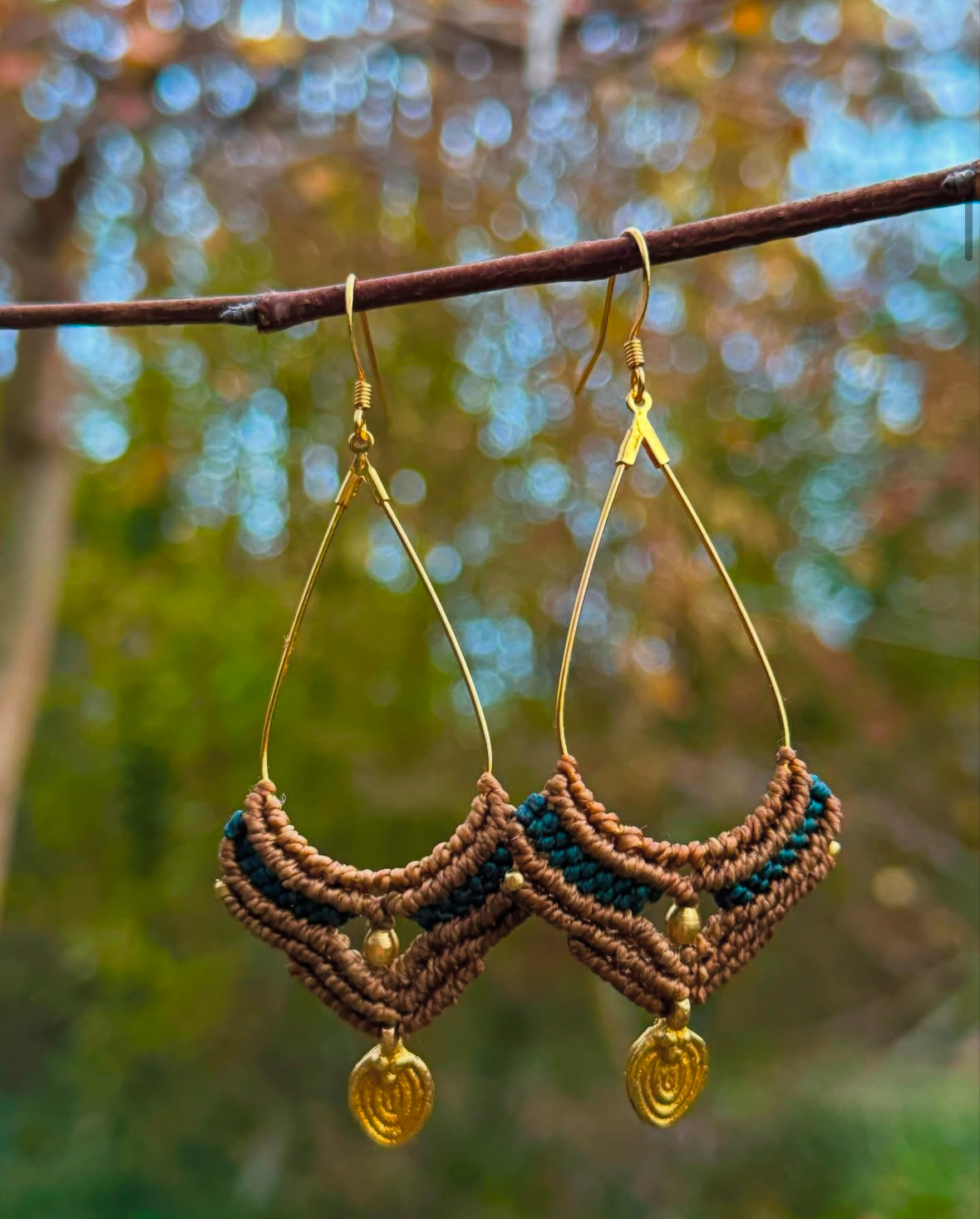 Boucles d’oreille en micro macramé, avec quelques perles en laiton. Attache & arceau en OR fin. Marron & bleu nuit 💙