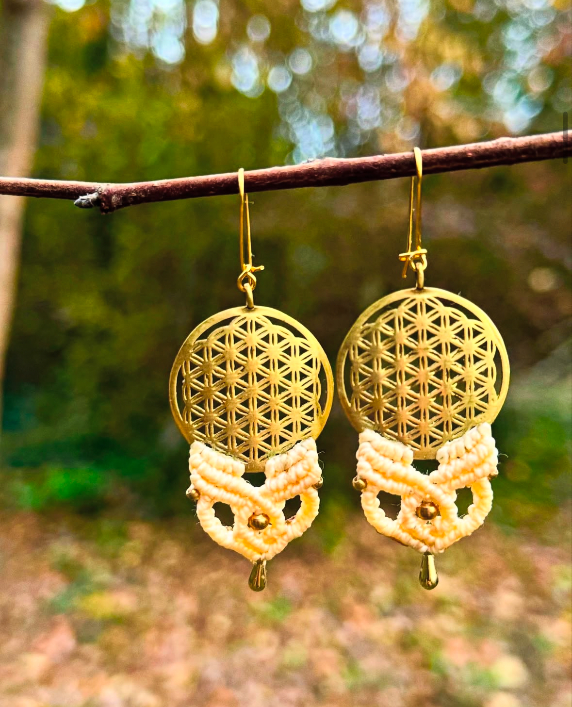 Boucles d’oreilles en micro-macramé, agrémentés de perles & d’une fleur de vie en laiton. Attache en OR fin, fil blanc cassé / crème 🤍