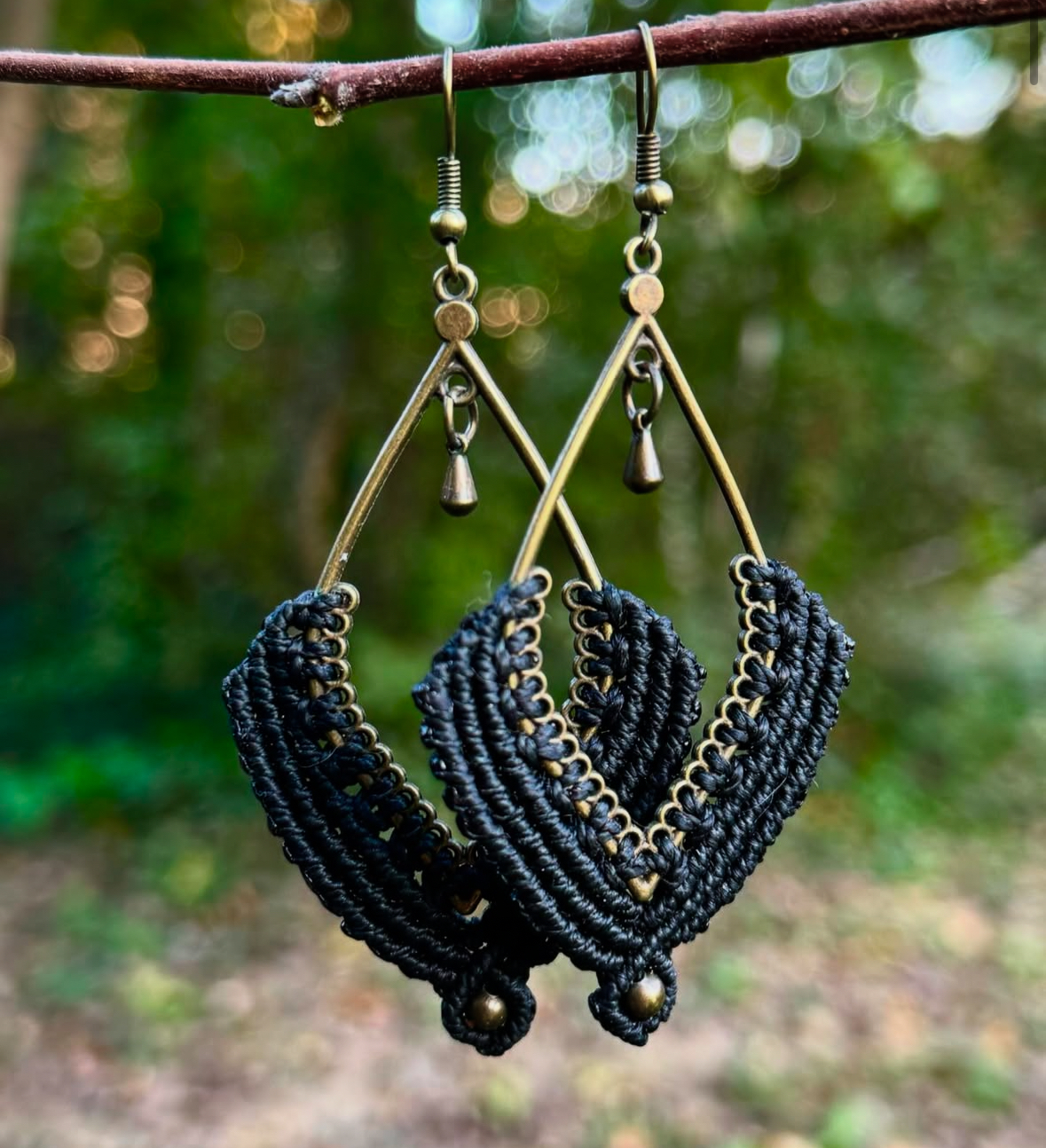 Boucle d’oreilles en micro-macramé. Attache en laiton brut, fil noir 🖤