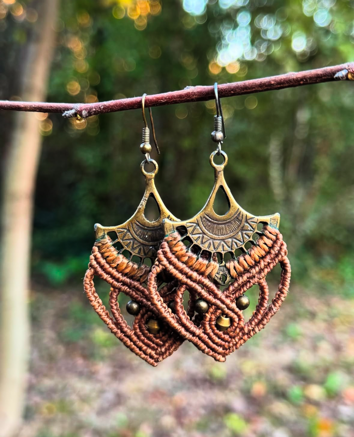 Boucles d’oreilles beige/marron en micro-macramé, agrémentées d’un apprêt & de perles en laiton