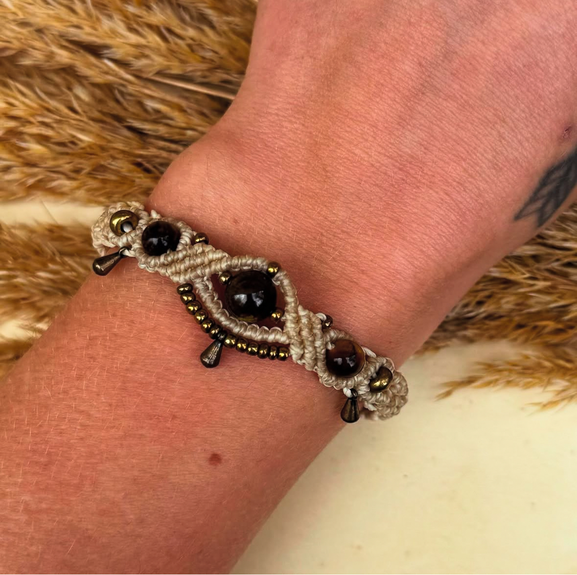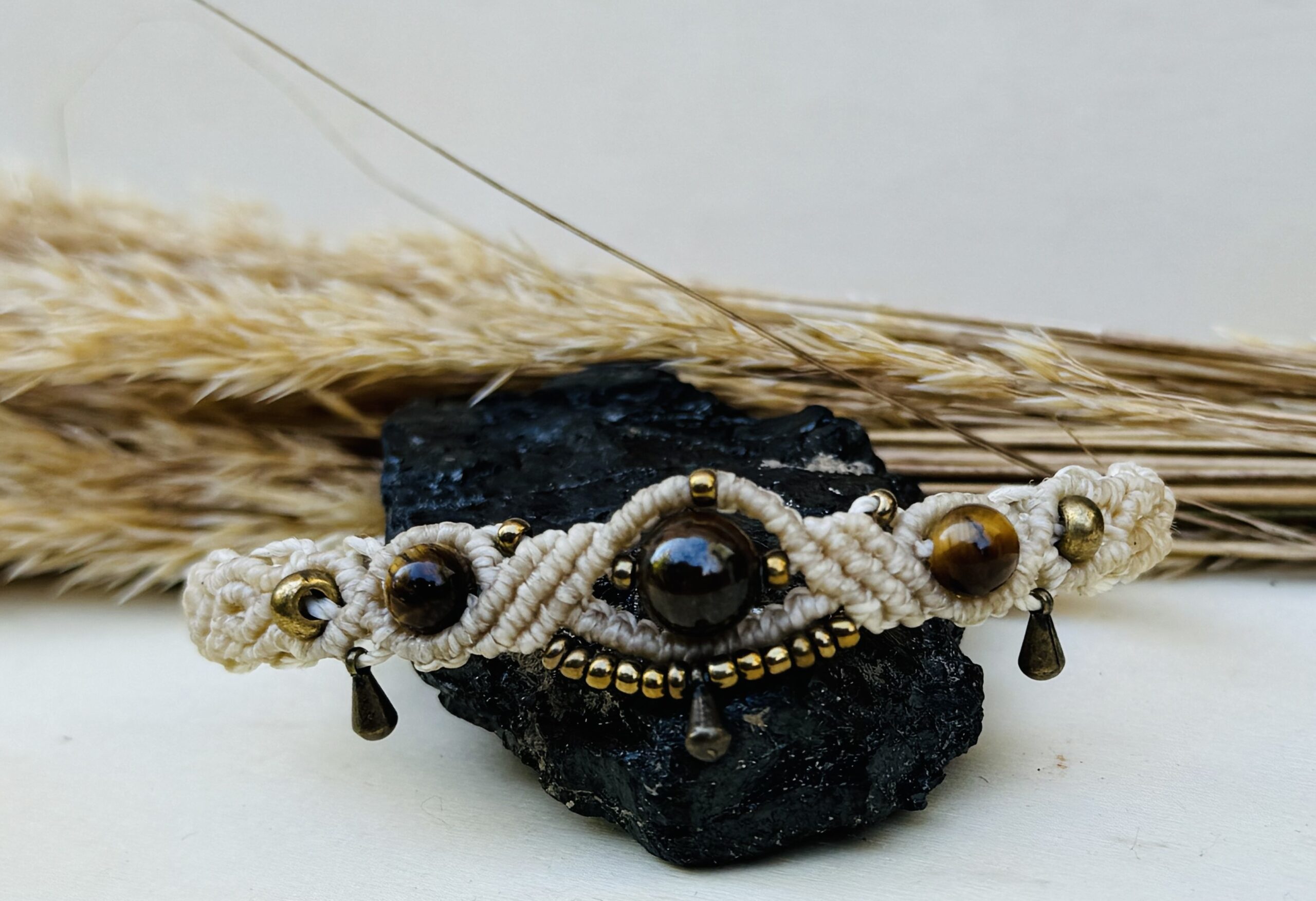 Bracelet beige en micro macramé, agrémenté de perles en laiton & de perles naturelles, 𝗹’𝗢𝗲𝗶𝗹 𝗱𝘂 𝗧𝗶𝗴𝗿𝗲 🤎
