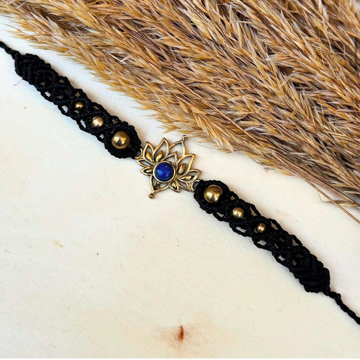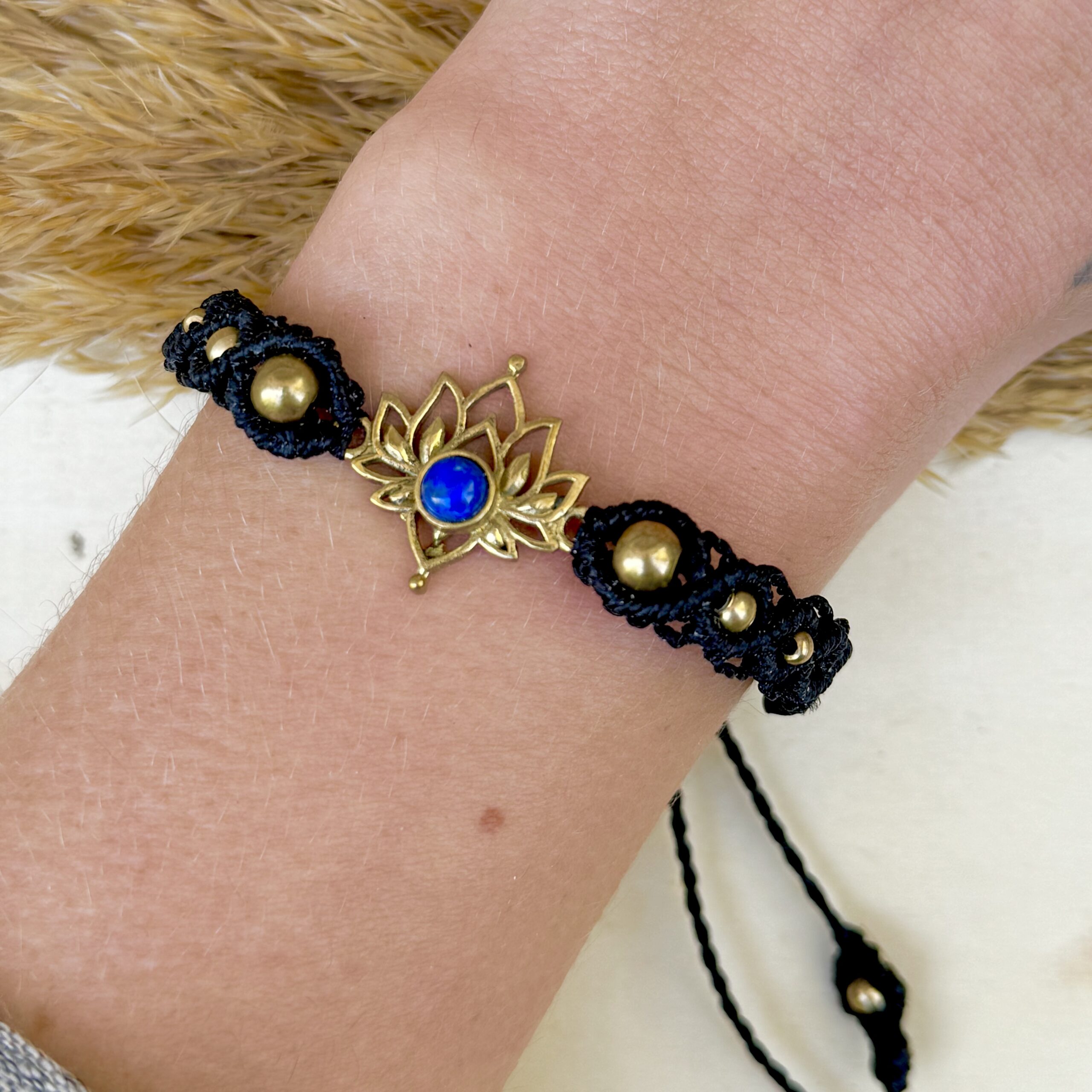 Bracelet en micro macramé, agrémenté de perles en laiton, d’une fleur de lotus & d’une perle naturelle, la 𝗟𝗮𝗽𝗶𝘇 𝗟𝗮𝘇𝘂𝗹𝗶 💙