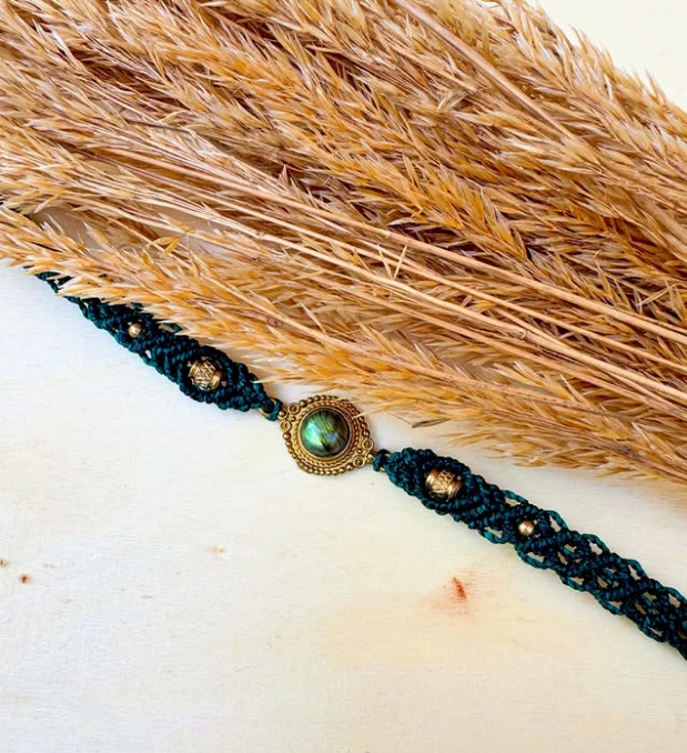 Bracelet en micro macramé, agrémenté de perles & d’un apprêt en laiton, orné d’une 𝕝𝕒𝕓𝕣𝕒𝕕𝕠𝕣𝕚𝕥𝕖 💙