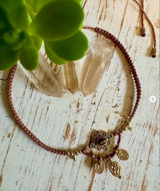 Collier ajustable (ras-du-cou ou plus long au choix) marron en micro macramé, agrémenté de perles & d’un apprêt en laiton, serti d’une pierre naturelle, 𝗹’𝗢𝗲𝗶𝗹 𝗱𝘂 𝗧𝗶𝗴𝗿𝗲 🤎