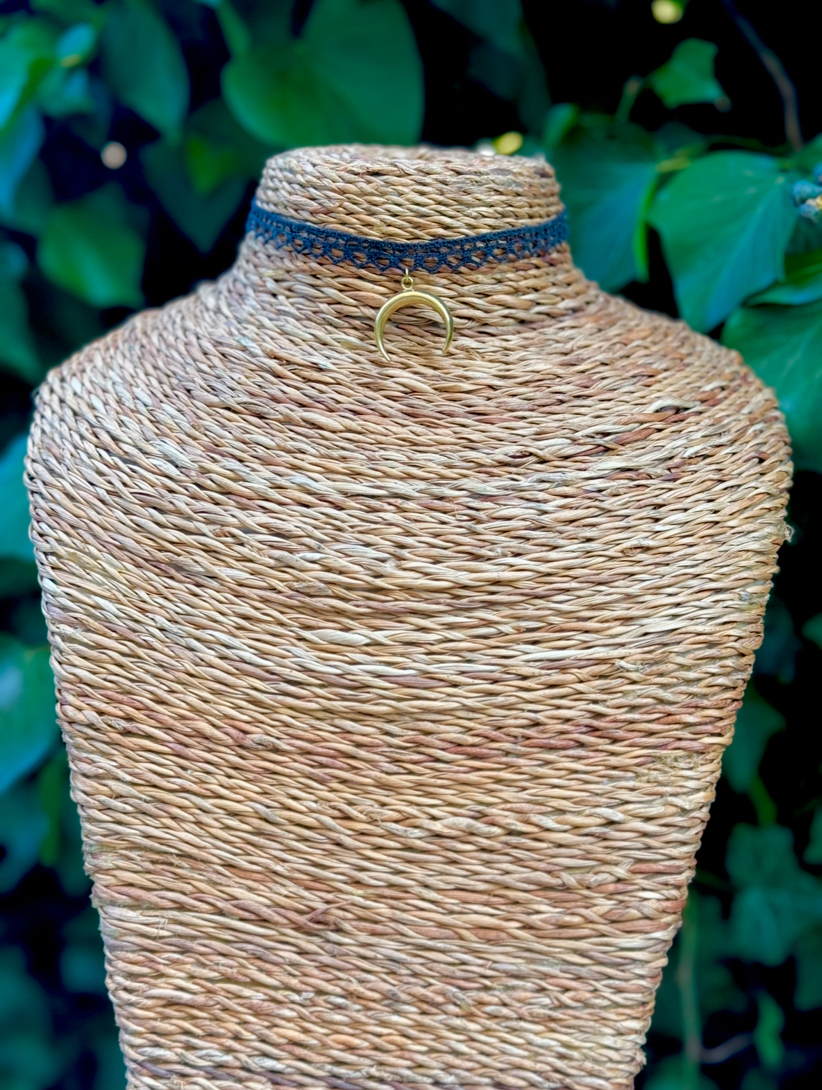 Ras-du-cou en coton brodé, agrémenté d’un pendentif lune & d’un fermoir en acier inoxydable doré. Coton noir 🖤