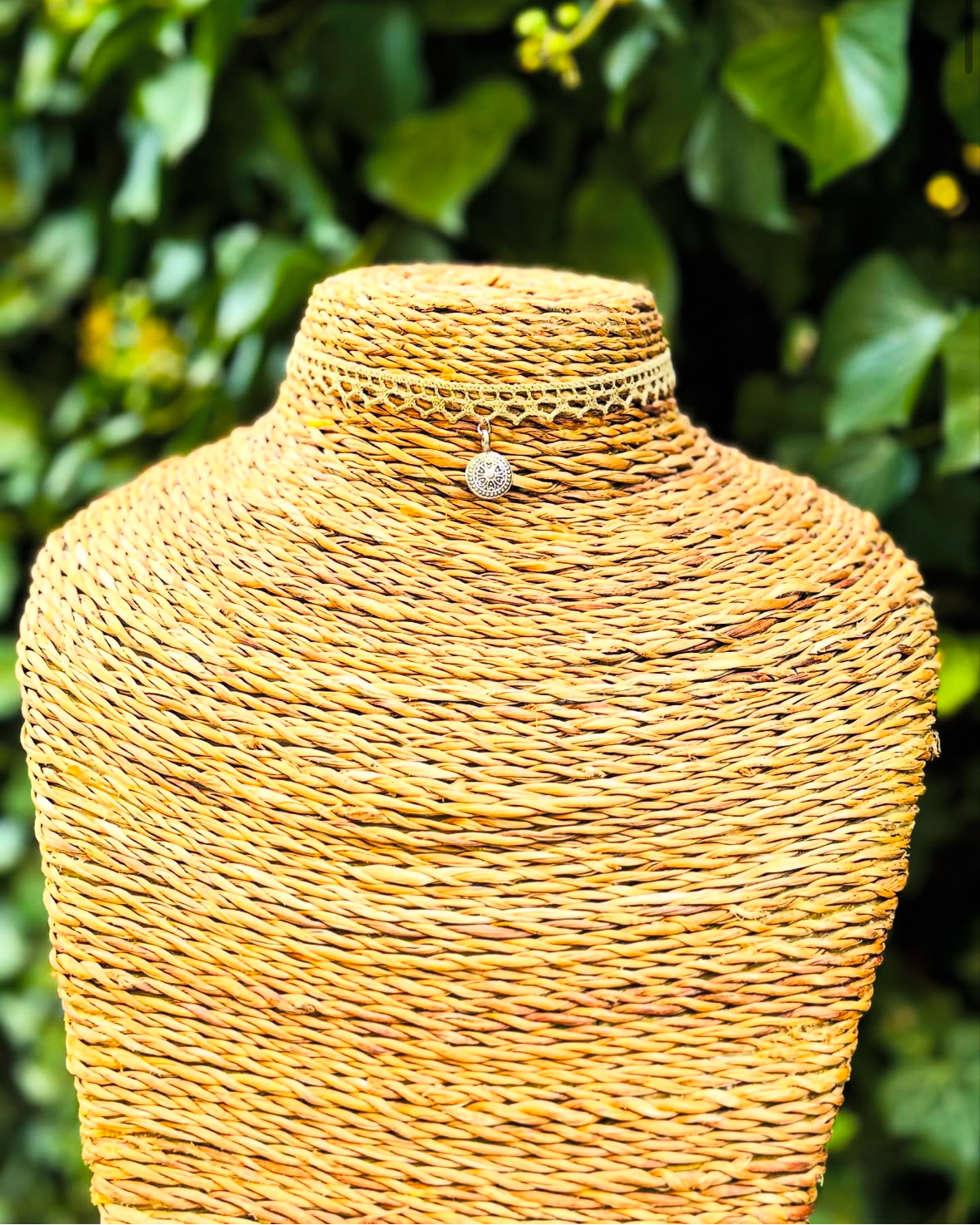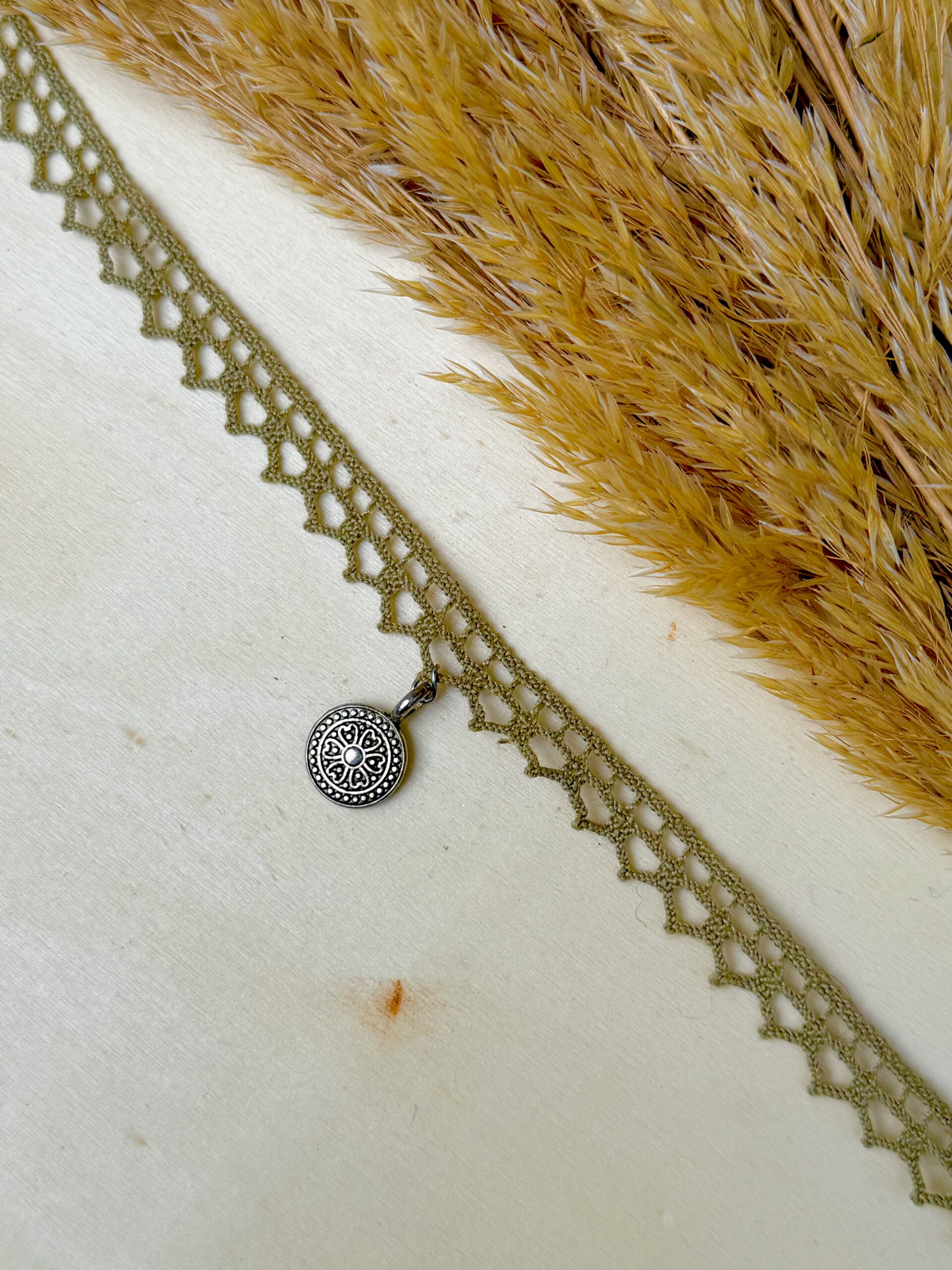 Ras-du-cou en coton brodé, agrémenté d’un pendentif & d’un fermoir en acier inoxydable, vert très clair 🤍